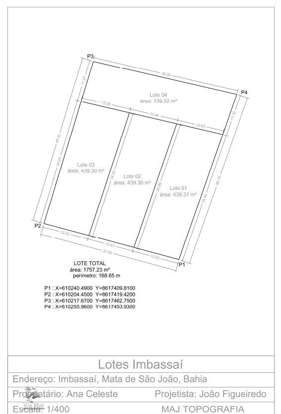 Ótima oportunidade de investimento! Terreno à venda no bairro IMBASSAÍ em Mata de São João-BA, com área total de 439.3m². Localizado em uma região privilegiada, próximo a escola, farmácia, igreja, padaria, praça, rodovia, supermercado e transporte público, oferece toda a comodidade e facilidades que você procura para construir a casa dos seus sonhos.